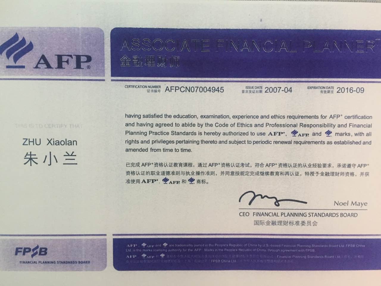 核心團隊成(chéng)員,高級理财經理,金融理财師(AFP)